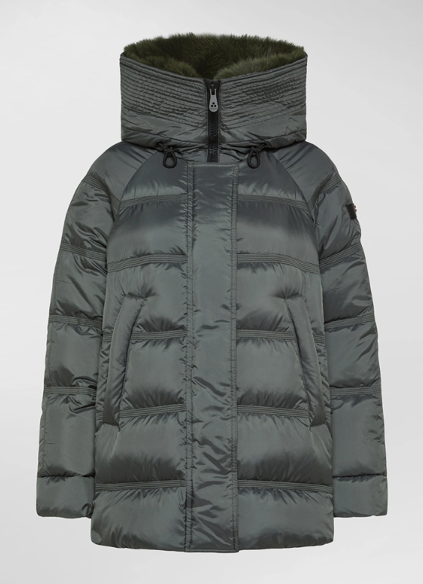 Puffer jacket ad ampie trapunte, in tessuto super-light in 100% poliestere riciclato da materiali post consumo, dalla mano morbida e dalla struttura super compatta. L’imbottitura in piuma d’oca certificata assicura calore elevato e leggerezza, mentre il trattamento idrorepellente PFC Free protegge senza l’uso di sostanze chimiche nocive. Di gusto urban sportswear, la shape ad A è regolabile grazie all’apertura delle zip laterali, mentre il cappuccio fisso è arricchito da un bordo in pelliccia di volpe staccabile in tono colore. Completano il modello le tasche a filetto, la chiusura con patta e bottoni che nasconde una zip a doppio cursore. Il modello, bestseller della collezione invernale di Peuterey, ora nei colori trend della stagione, può essere indossato anche in occasioni eleganti e mondane.
