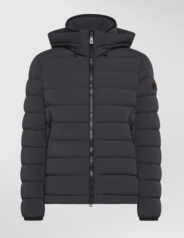 Piumino corto in tela stretch realizzata in fibra cava di nylon opaco elasticizzato, che conferisce al capo comfort, leggerezza e allo stesso tempo volume. La trapunta esalta la linea essenziale e versatile del design. L’imbottitura in piuma naturale certificata offre un calore avvolgente e garantisce allo stesso tempo traspirabilità e leggerezza. l tessuto, water repellent e down proof, è trattato con finitura idrorepellente priva di PFC (composti fluorurati), per una protezione efficace e priva di sostanze nocive. Il design è completato da un cappuccio staccabile e regolabile, da un collo in piedi e dettagli neri – zip frontale a doppio cursore, ampie tasche laterali e polsini antivento – che sottolineano il carattere active e contemporaneo, perfetto per il guardaroba quotidiano.