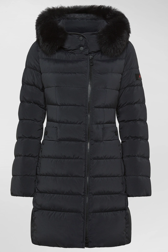 Piumino lungo trapuntato in leggero popeline di nylon e microfibra di poliestere, trattato ad alta temperatura per ottenere una mano sostenuta e un tatto polveroso, poi reso estremamente morbido grazie a un finissaggio al silicone. L’imbottitura in piuma naturale certificata assicura protezione termica con leggerezza, mentre il trattamento idrorepellente mantiene il comfort anche in caso di pioggia leggera. Il design è definito da una zip centrale a doppio cursore, collo avvolgente con bottoni a pressione tono su tono e cappuccio con bordo in pelliccia di volpe, removibile. Le tasche laterali con bottone a pressione completano un capo raffinato e funzionale, perfetto per l’inverno in città. Un modello iconico del brand, reinterpretato con dettagli moderni ed ancora più raffinati.