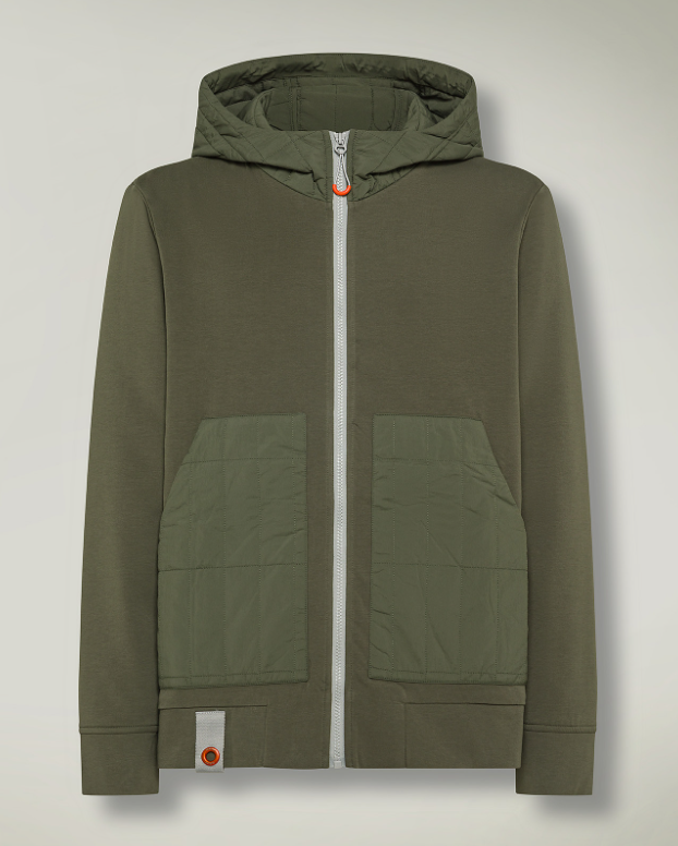 Felpa hybrid realizzata in doppio tessuto per unire comfort urbano, leggerezza e funzionalità tecnica. Il corpo è in scuba misto cotone e poliestere elasticizzato, dalla mano morbida e avvolgente. In contrasto, i dettagli - come tasche frontali, cappuccio e retro del capo – sono in nylon superleggero 20 denari, trapuntato a lingotti, dal finish semi-opaco e trattamento water repellent: un elemento distintivo che aggiunge un tocco materico, tecnico e protettivo. Completano il capo il fondo e i polsini elasticizzati, la full zip centrale con tirazip arancio, il cavallotto con l’iconico oblò metallico applicato sul fondo e nastro arancione logato sul retro, simboli iconici del brand. Il contrasto visivo e funzionale tra i due tessuti riflette l’approccio DUAL del brand, che fonde superfici diverse in un’estetica versatile e dinamica.