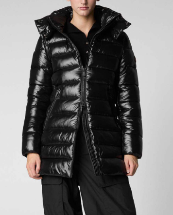 Piumino dalla line sfiancata in tessuto riciclato effetto laccato antivento. Collo alto e cappuccio staccabile. Chiusura a cerniera a doppio cursore. Tasche laterali inserite in cucitura e patch logo in gomma cucito sul petto. Indice di calore: Warm.
