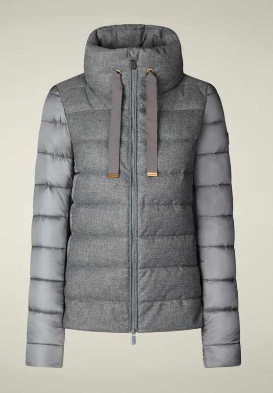 Il piumino donna ibrido modello Selin combina materiali diversi in un design contemporaneo e versatile. Corpo e collo sono realizzati in flanella tecnica, morbida come la lana ma in poliestere riciclato, mentre le maniche sono in nylon brillante. Collo alto regolabile, zip lucida, tiretti personalizzati e logo tondo sulla manica completano il look con un tocco distintivo.